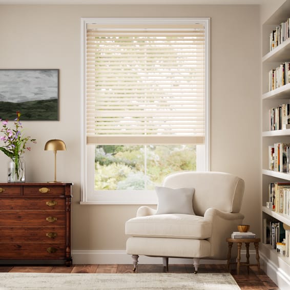 クリーン ライトベージュ ウッドブラインドはベージュの木目が塗装されたナチュラルなウッドブラインド。 PVC樹脂製なので湿気に強くお手入れも簡単。お手頃価格で使用用途が広く汎用性の高い人気のアイテムです。