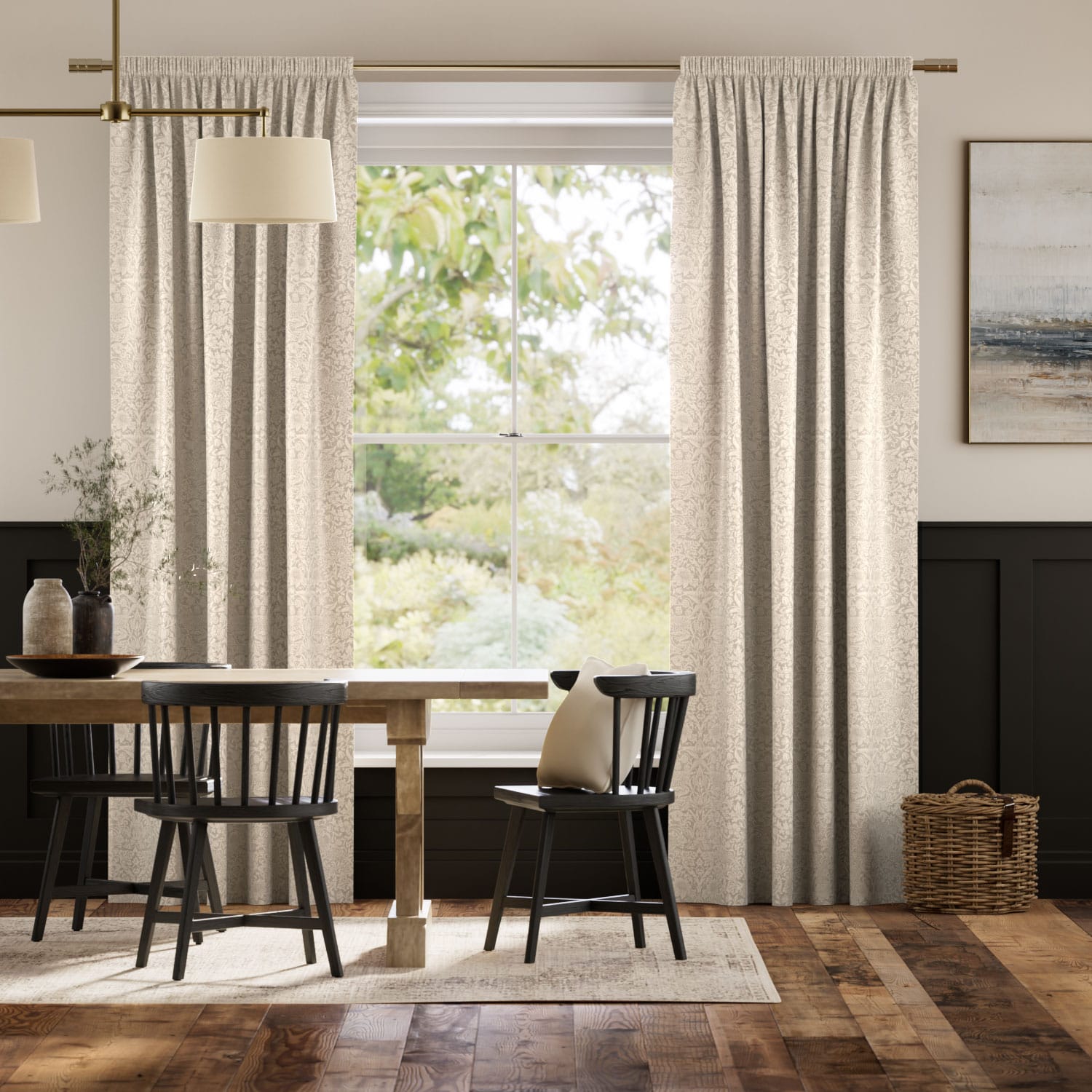 ソフトゴールドの淡いオレンジの色合い、複雑なディテールと愛らしいモチーフ、ジャガード織の上品な質感が調和したカーテンは、伝統のアーツ・アンド・クラフツデザインの美をより身近に感じていただけるでしょう。寝室やリビング、和室洋室問わず、伝統建築から近代インテリアまで幅広くコーディネートいただけます。