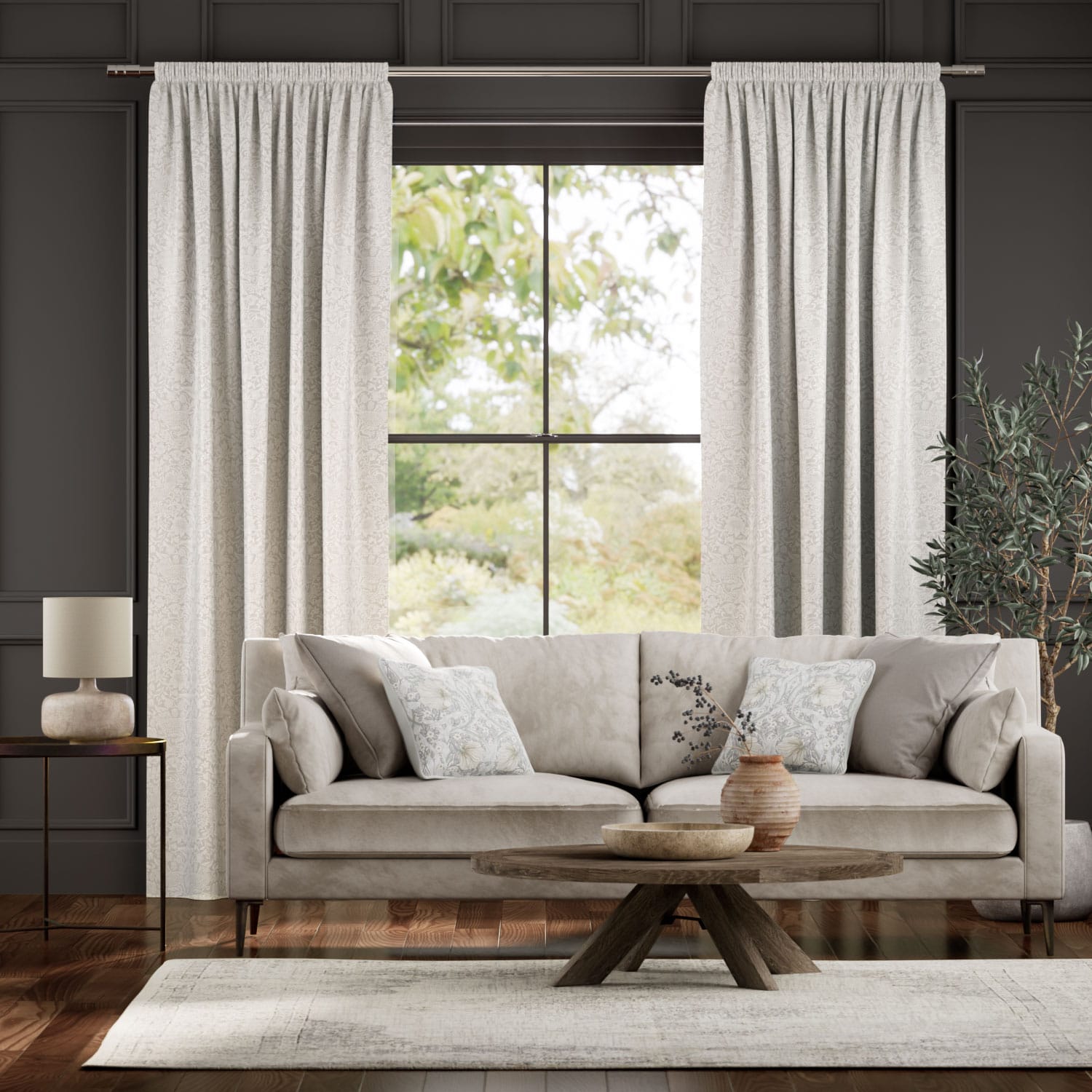 ほのかなオイスターグレーの落ちついた色合い、複雑なディテールと愛らしいモチーフ、ジャガード織の上品な質感が調和したカーテンは、アーツ・アンド・クラフツの伝統美をより身近に感じていただけるでしょう。寝室やリビング、和室洋室問わず、伝統建築から近代インテリアまで幅広くお使いいただけます。
