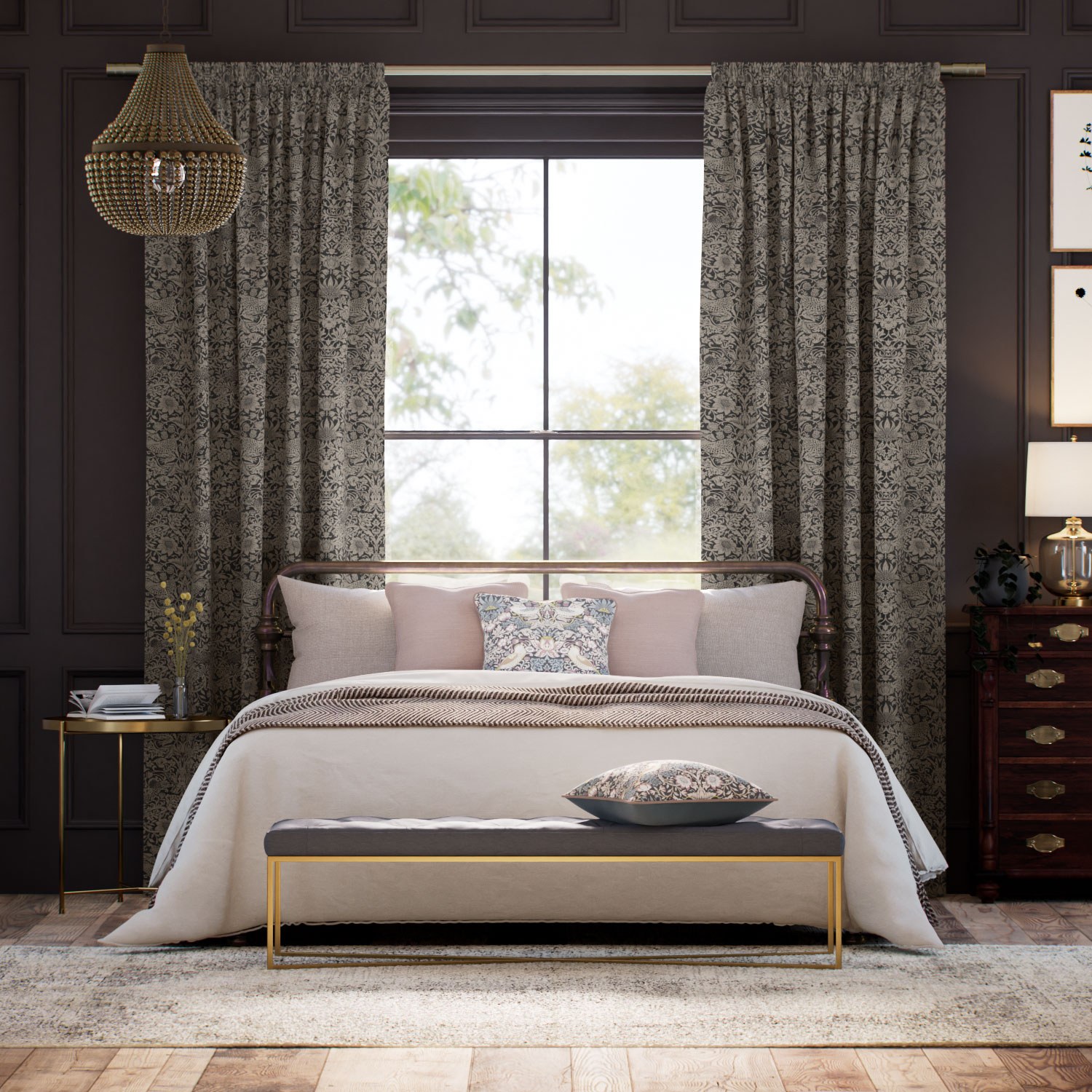 モリスの代表作である複雑なディテールの愛らしいモチーフをメタリックブロンズトーンの風合いあるジャカード生地で織りなした高級感のあるカーテン。 アーツ・アンド・クラフツデザインの伝統美を取り入れることで、お部屋を贅沢で居心地の良い雰囲気に演出できます。 ダークウッドの家具やニュートラルトーンのインテリアとのコーディネートがおすすめです。