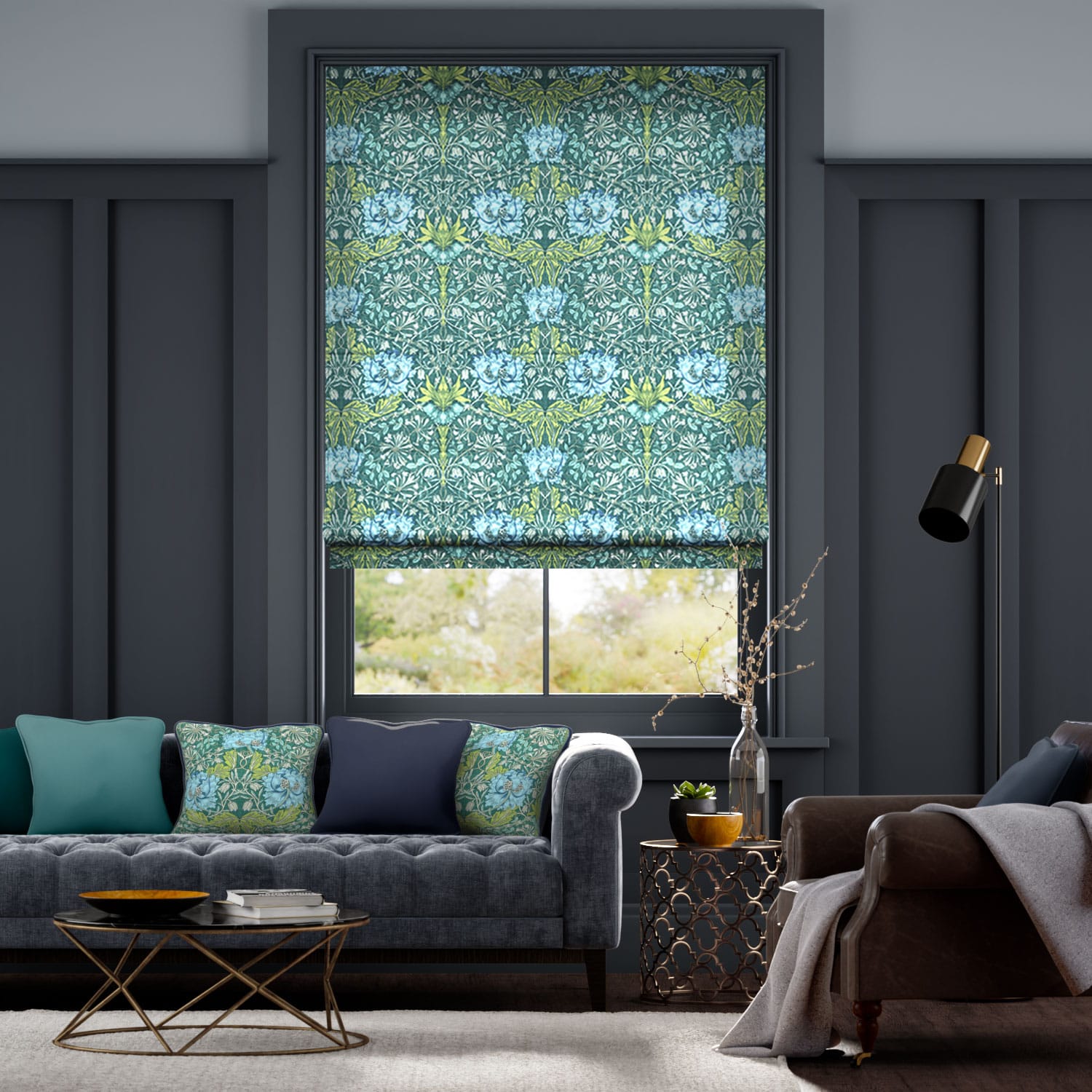 「ベルベット・ムーンストーン」カラーは、光沢のあるベルベット生地のグリーンを背景に、ライトブルーのチューリップとクリーム色のハニーサクルの花、ライトグリーンのリーフのモチーフが描かれたローマンシェードです。ウィリアムモリスの典型的で独特な美しいデザインは、モリスのファンはもとより、和室洋室問わず、伝統的なインテリアからモダン建築まで幅広くお使いいただけます。