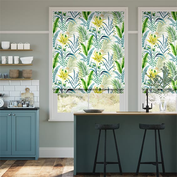 シンプルな白いリネンの背景に鮮やかな色合いの草花が広がります。新鮮な緑や青緑色、ライム、陽射しのようなイエローで鮮やかな表現がされています。