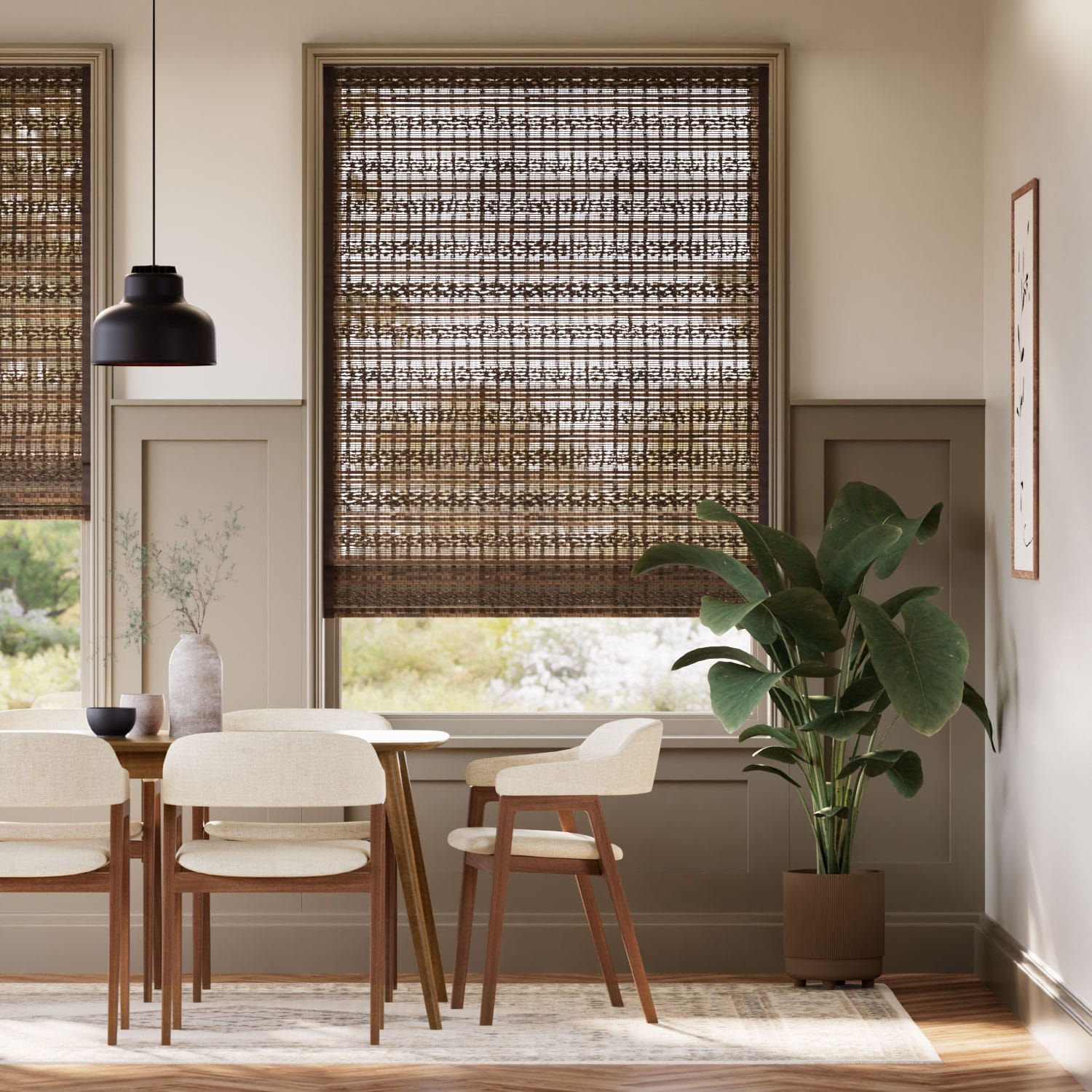 天然の竹とジュートを丁寧に編み込んで作られた、ロザリオ ウォールナット&エイコーンは、どんなお部屋にも合わせやすいローマンシェードです。 深みのあるブラウンの色合いに、細く繊細なテープがアクセントとして付き、モダンな印象に仕上げました。