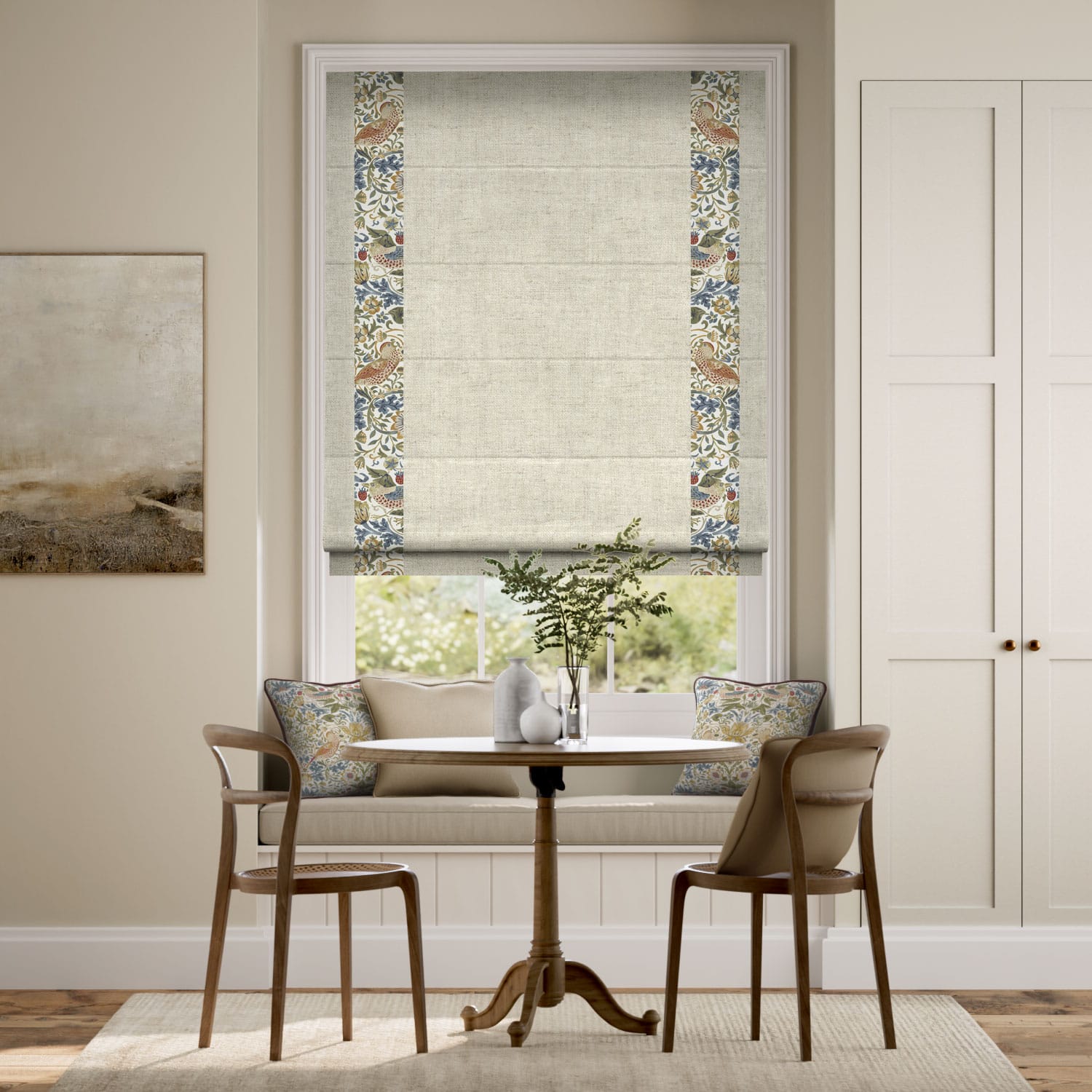 V&Aとのコラボレーションから生まれた 「いちご泥棒(柄名)ナチュラル(カラー)」と「パレオリネン(素材名) ビンテージクリーム(カラー)」を組み合わせたローマンシェード。