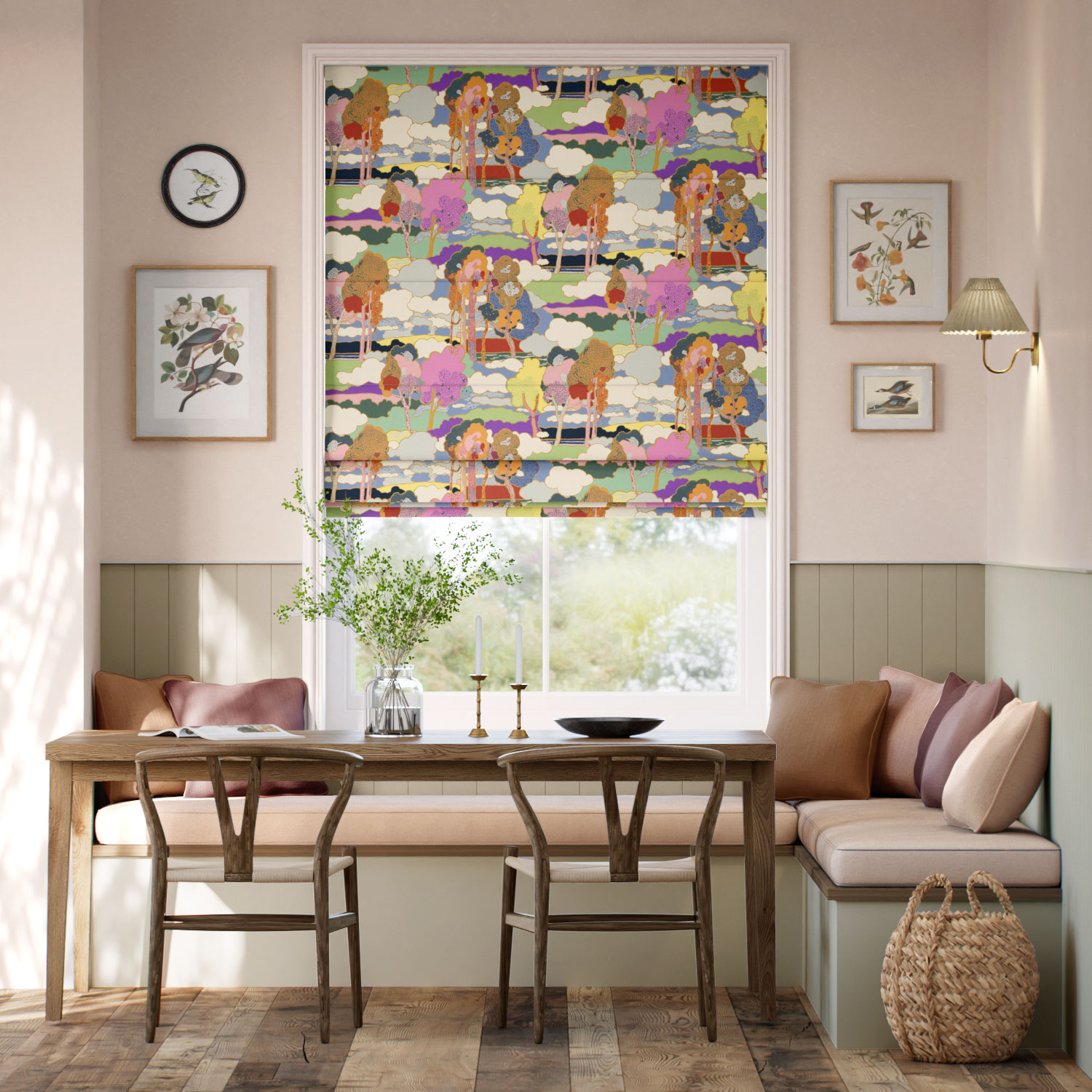 プロスペクト・ロード ダスクのローマンシェードは、アール・ヌーボー風景画からインスパイアされたデザインです。夜空を思わせるダークブルーの地に描かれた星や植物たちが、幻想的な雰囲気を醸し出します。このデザインは、お部屋に特別な存在感を与え、寝室やリビングルームでの使用にぴったりです。