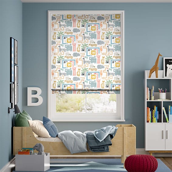 ジャングル・ジグル ソルベ ローマンシェードは、柔らかなパステルカラーで描かれたライオンやキリンなどの動物たちが特徴的なデザインで、子供部屋やベビールームにぴったり!楽しく明るい雰囲気を演出します。