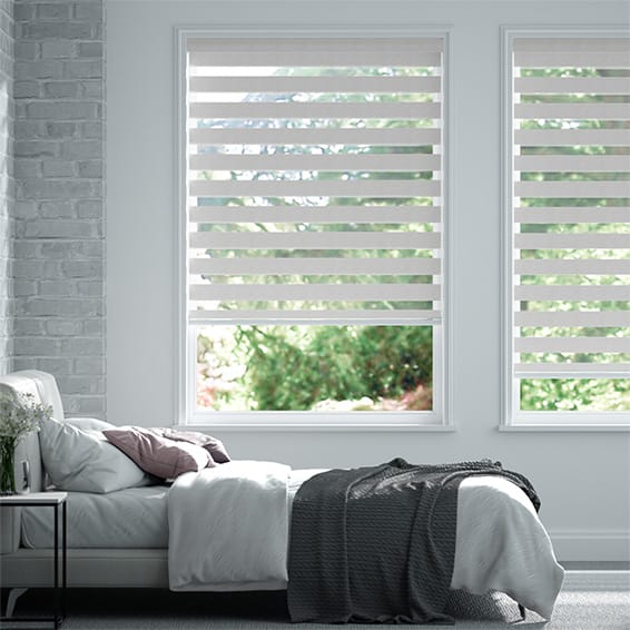 調光ロールスクリーンは厚手生地と薄地ボイルがゼブラの横縞に織り込まれた生地を、前後で上下にスライドさせることでアルミブラインドのように光を調節できます。