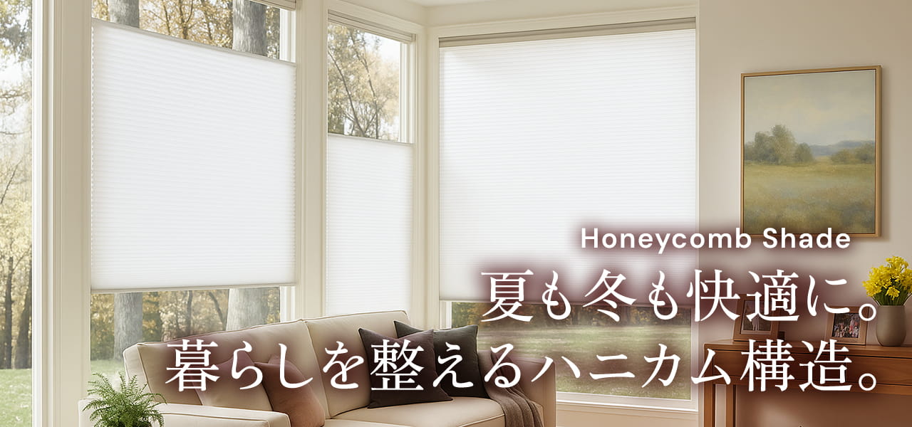 ハニカムシェード(ハニカムスクリーン)は、ブラインドの断面がハニカム(蜂の巣)の形状をしたブラインドです。このハニカム構造は六角形のスクリーンに空気層を作ることで、冬は冷たい外気を防ぎ、夏は熱い外気を跳ね返し高い省エネ効果を発揮します。スタイリッシュでエレガントなデザインのプリーツスクリーンを引き上げると、外の景色を十分に楽しむことができます。