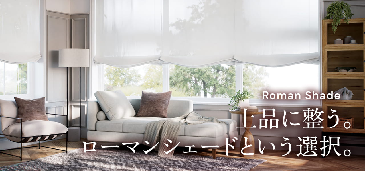 ローマンシェードは、カーテンが左右に開くのに対し、メカを利用して1枚の生地を上下に折り畳みながら開閉します。カーテンと同じ生地を使用しているので、生地の特性や風合い、柔らかさを生かせるブラインドです。外からの視線が気になったり、日差しを遮りたいけれど閉めるとお部屋が暗くなってしまうという時も、自由に日差しを調節しながら、外からの視線も避けられます。スマホで簡単に操作可能な「電動ローマンシェード」もご用意しています。